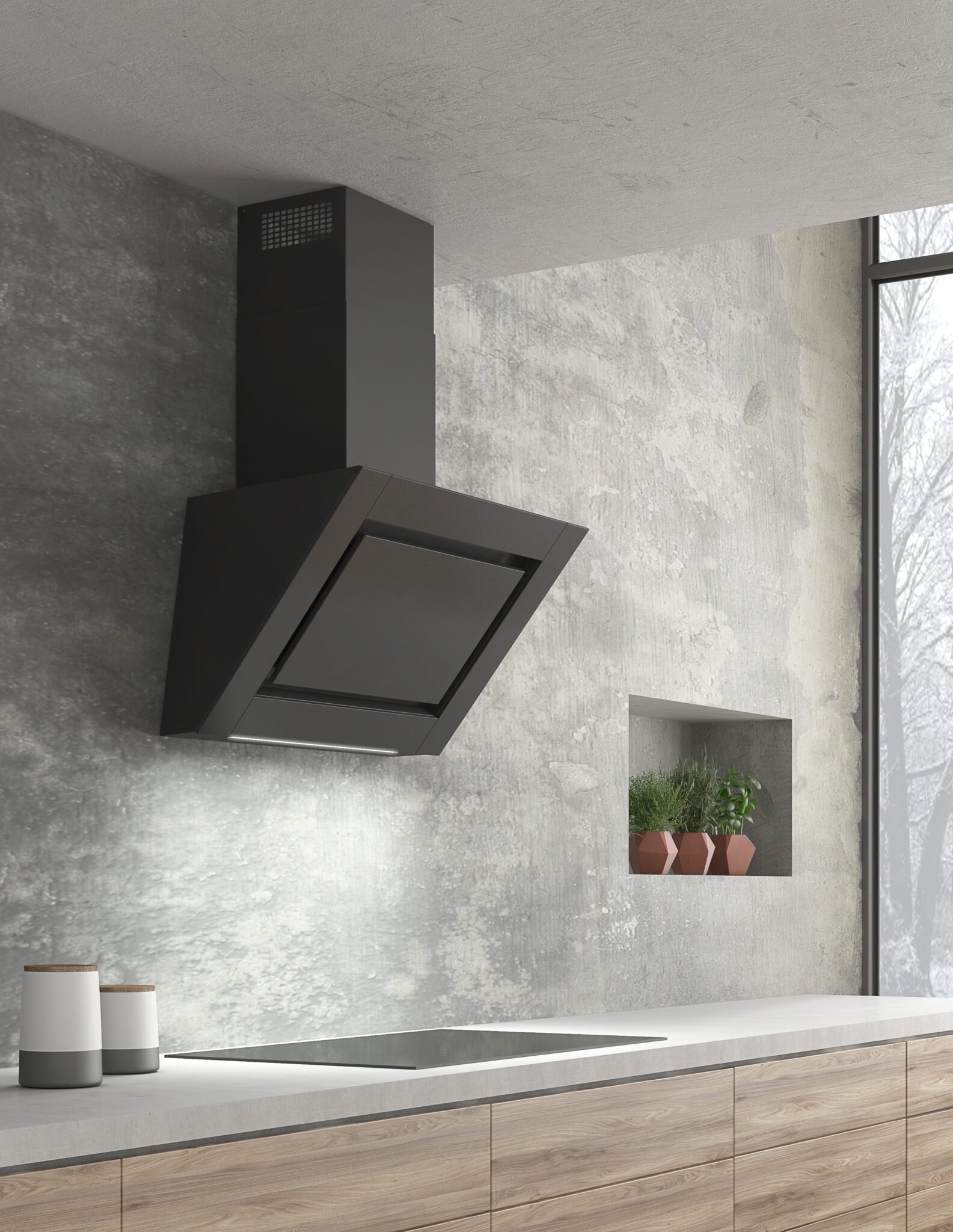 Emhætten leveres som standard med matsort front og sort bagpanel. Midterpanel, sidepanel og kanal kan lakeres i valgfri farve, så du kan vælge det udtryk, der passer bedst til dig og dit køkken.