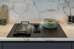 Med en ventilator integrert i kokeplaten slipper du en kjøkkenhette som tar plass på veggen eller i overskapet. Dette gir et mer åpent og moderne uttrykk, perfekt for minimalistiske hjem.
