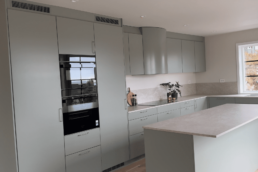 Hetten er lakkert i samme farge som frontene, den dempede og elegante Salviegrønn (S4005-G50Y). I tillegg er den levert i spesialmål som følger overskapenes høyde, noe som gjør at den glir sømløst inn i rommet og setter prikken over i-en i dette gjennomførte og harmoniske kjøkkenet.