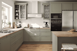 Mantica fritthengende lakkert i grått, samme farge som kjøkkenfrontene.