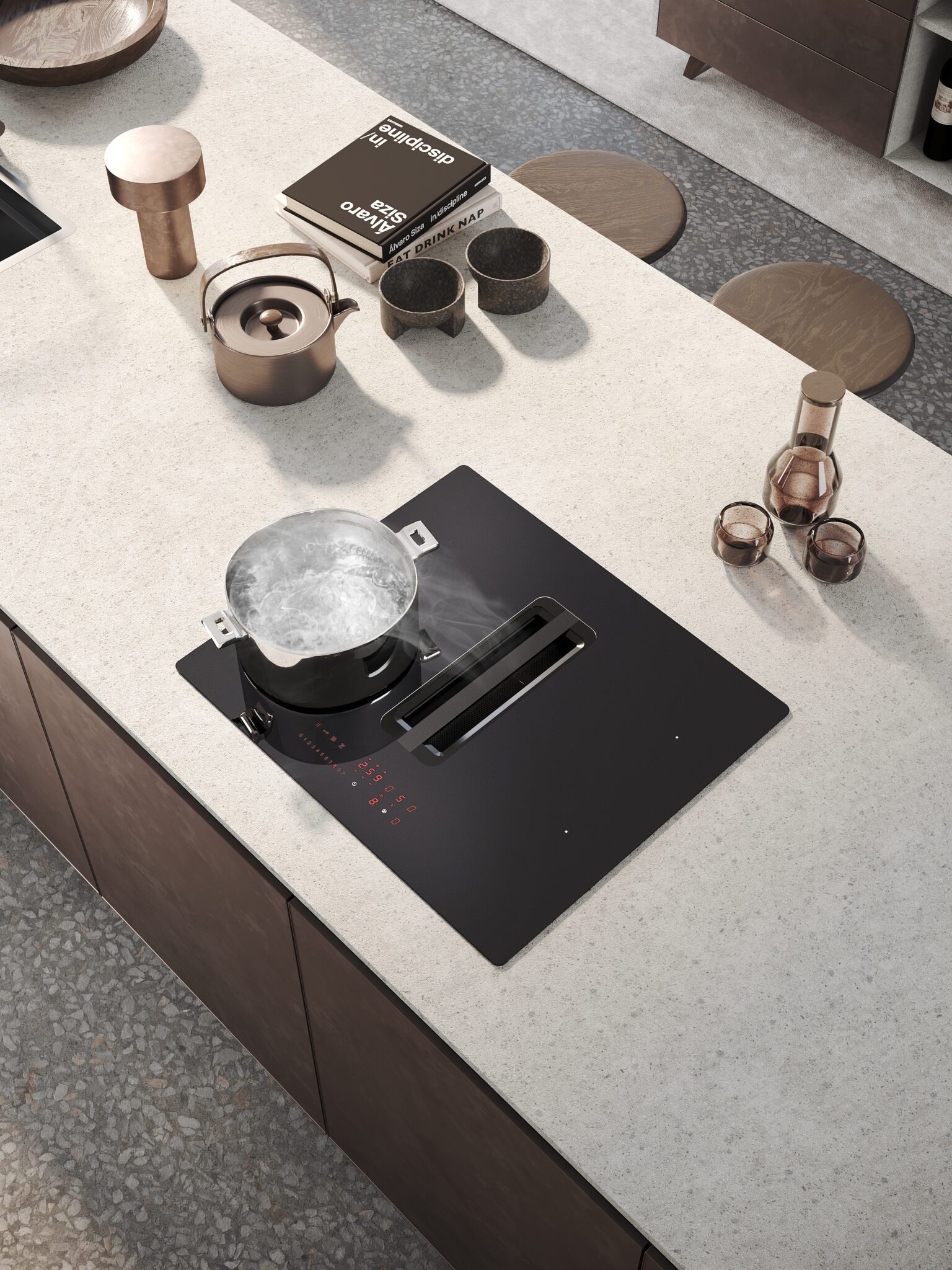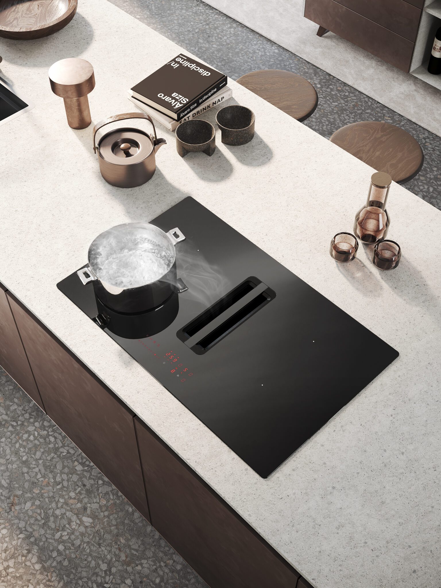 - Touch-panelet er plassert i midten for størst mulige kokesoner og enkel betjening.