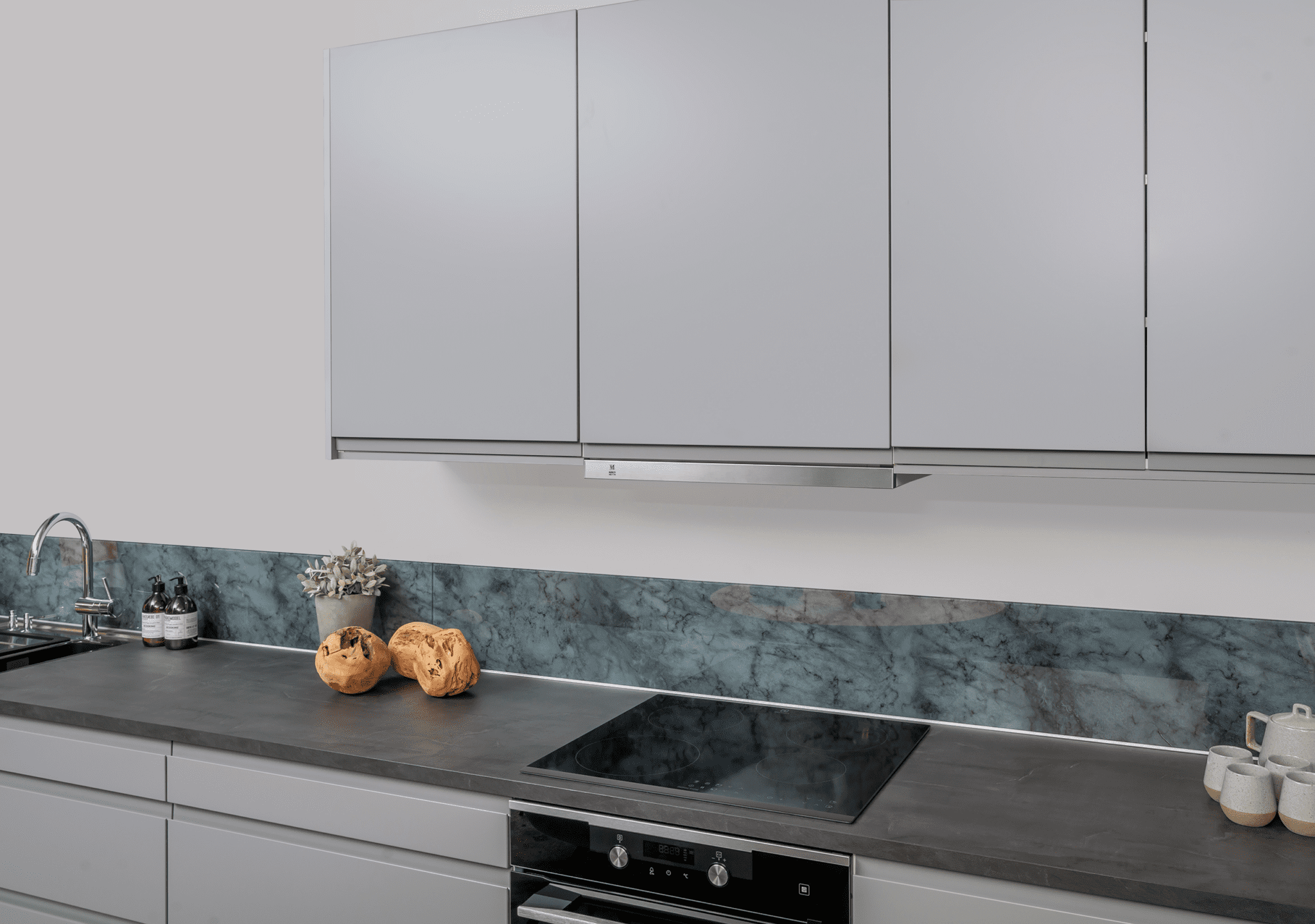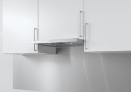Crystall 1140 er en uttrekksventilator med sølvgrå forkantlist som enkelt kan byttes ut til medfølgende sort list.