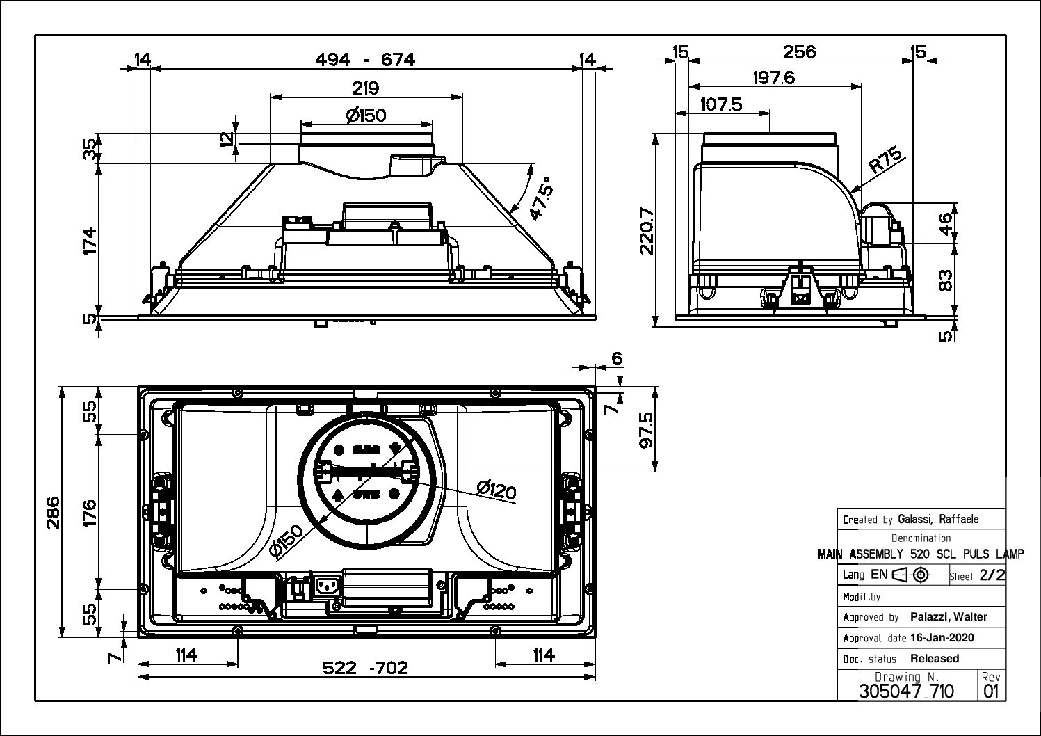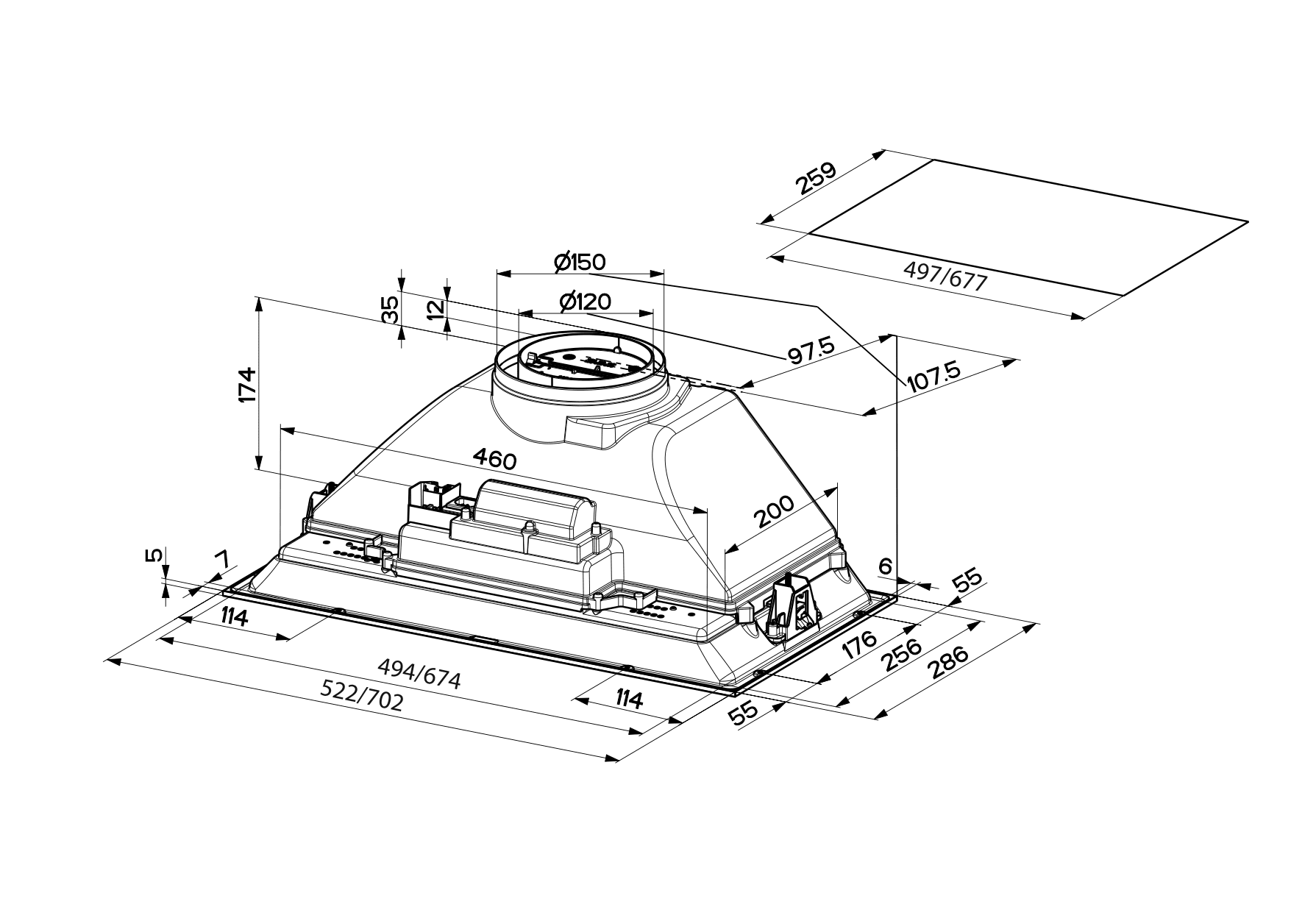 - Dimensjon uttak: 120/150 mm
